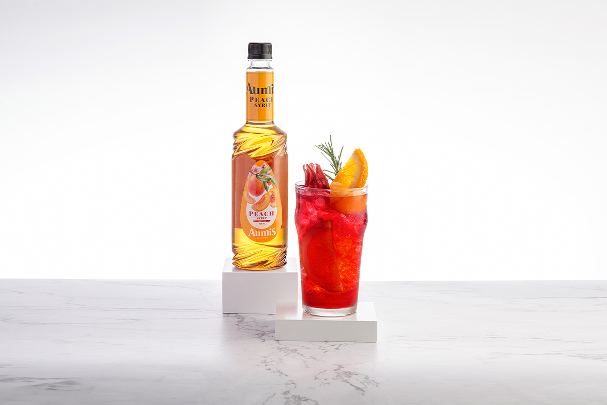 - Sau khi một ly trà hibiscus đào thơm ngon hoàn thành, trang trí ly với 1 lát cam, 1 – 2 bông hoa hibiscus và 3 miếng đào.